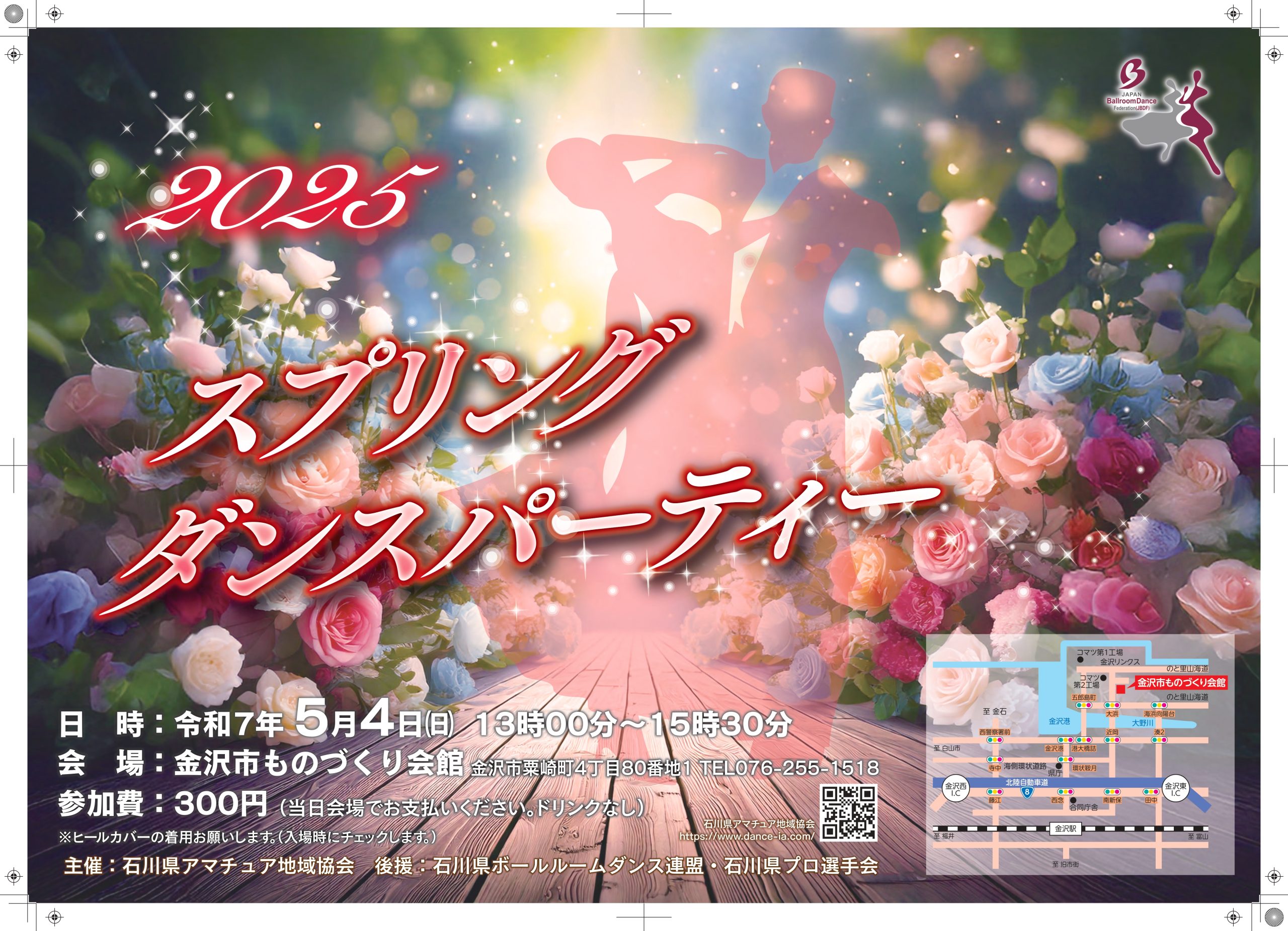 また、同日午後1:00から石川県アマチュア地域協会主催の「スプリングダンスパーティー」(金沢市ものづくり会館)を行います。参加者に充分に楽しんで頂けるように、「ミニデモ」や「運命の赤い糸」などを企画してます。またチェーンダンスやフリーダンスタイムも、もちろんあります。